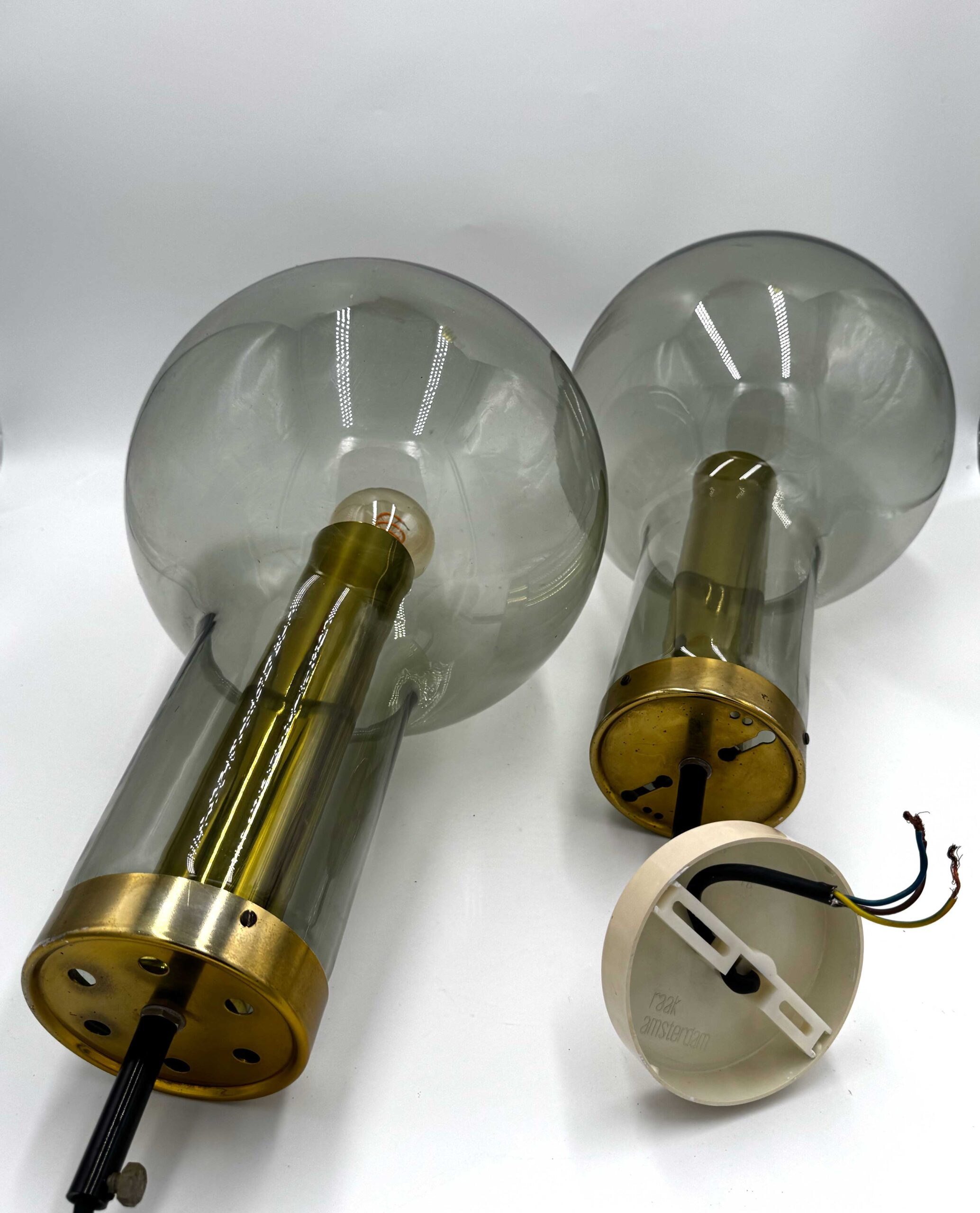 The Maxi Bulb comes in three sizes (M, L and XL). This is the largest (XL) version. The lamps have gray smoked glass shades and gold-coloured brass fittings.