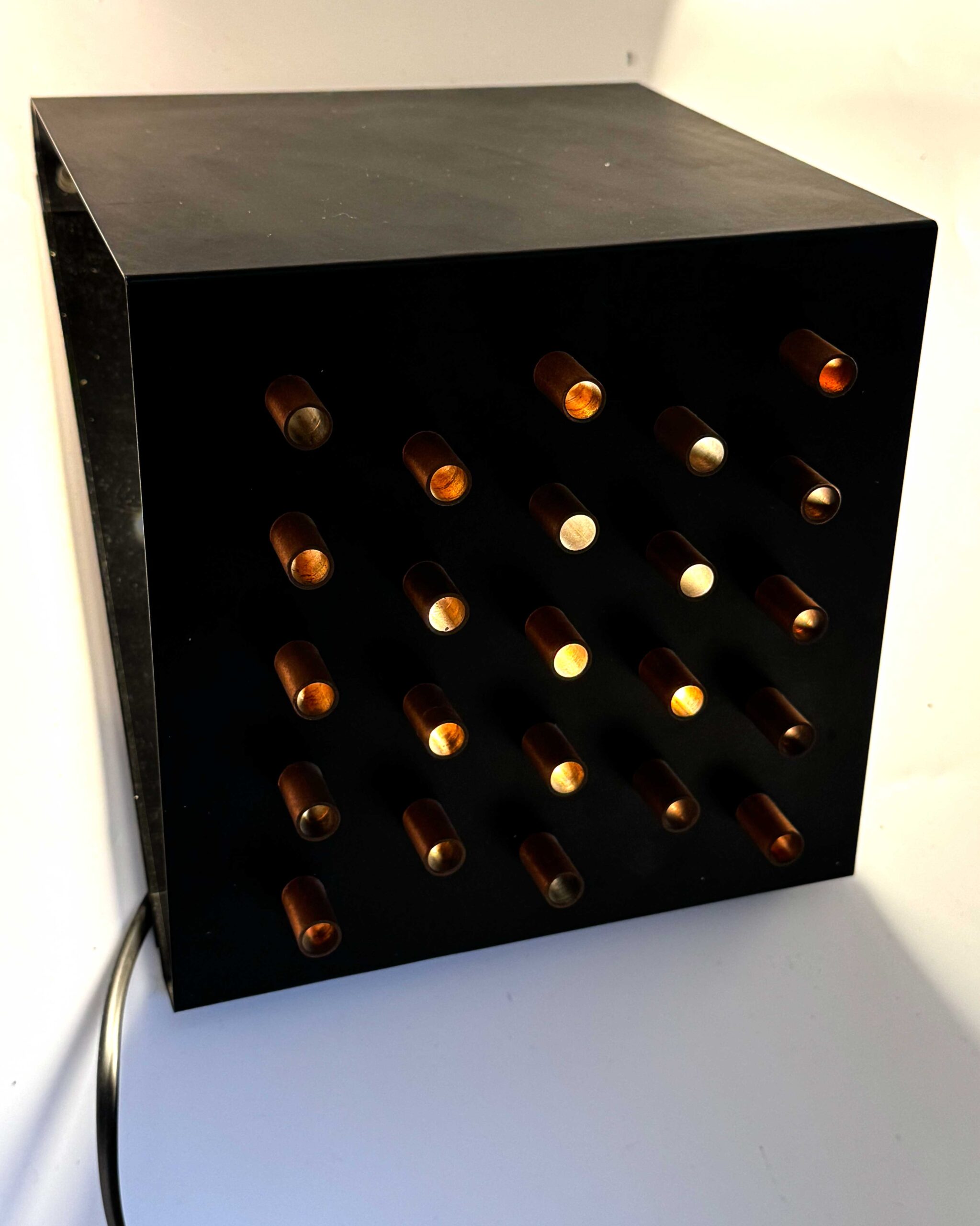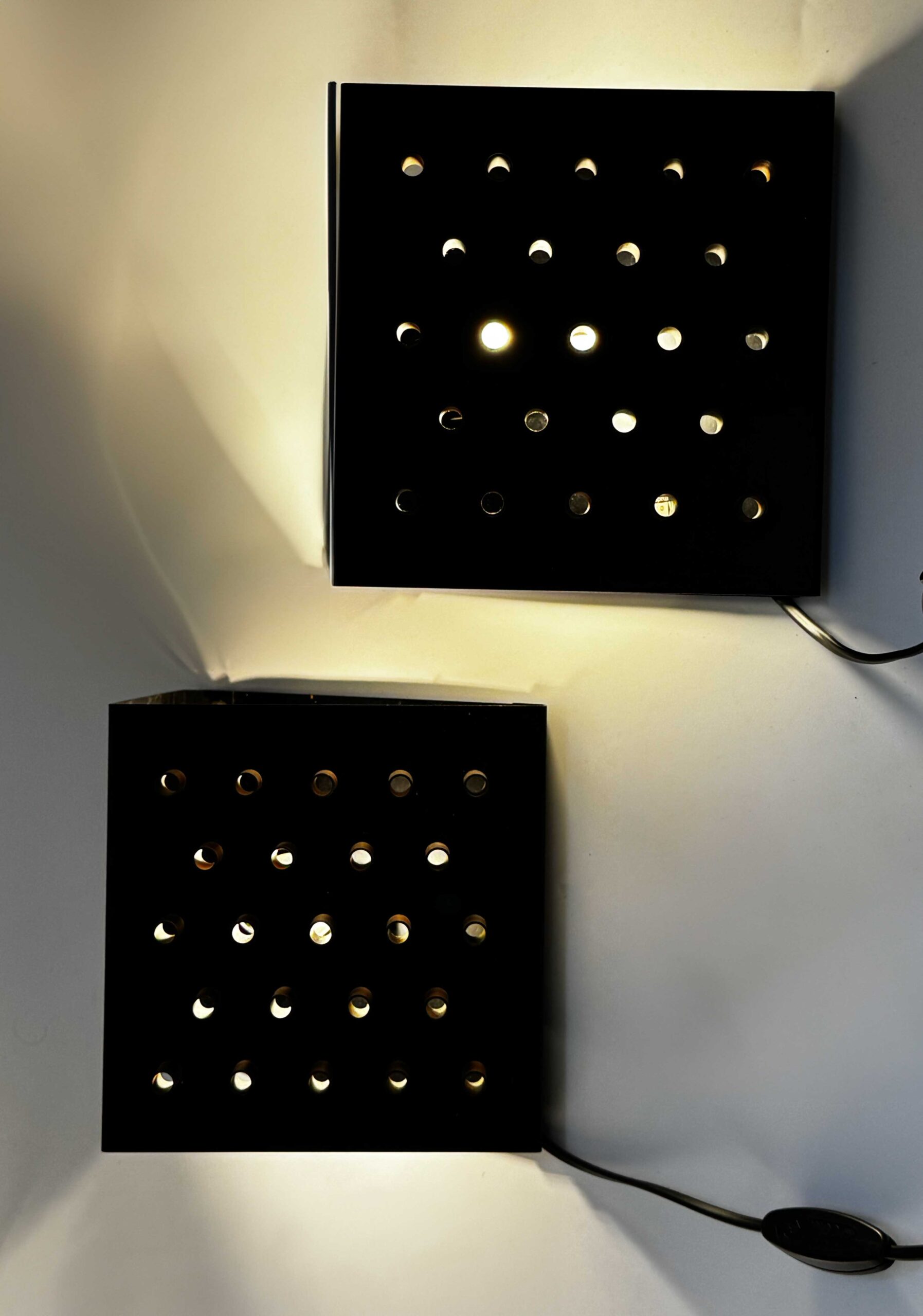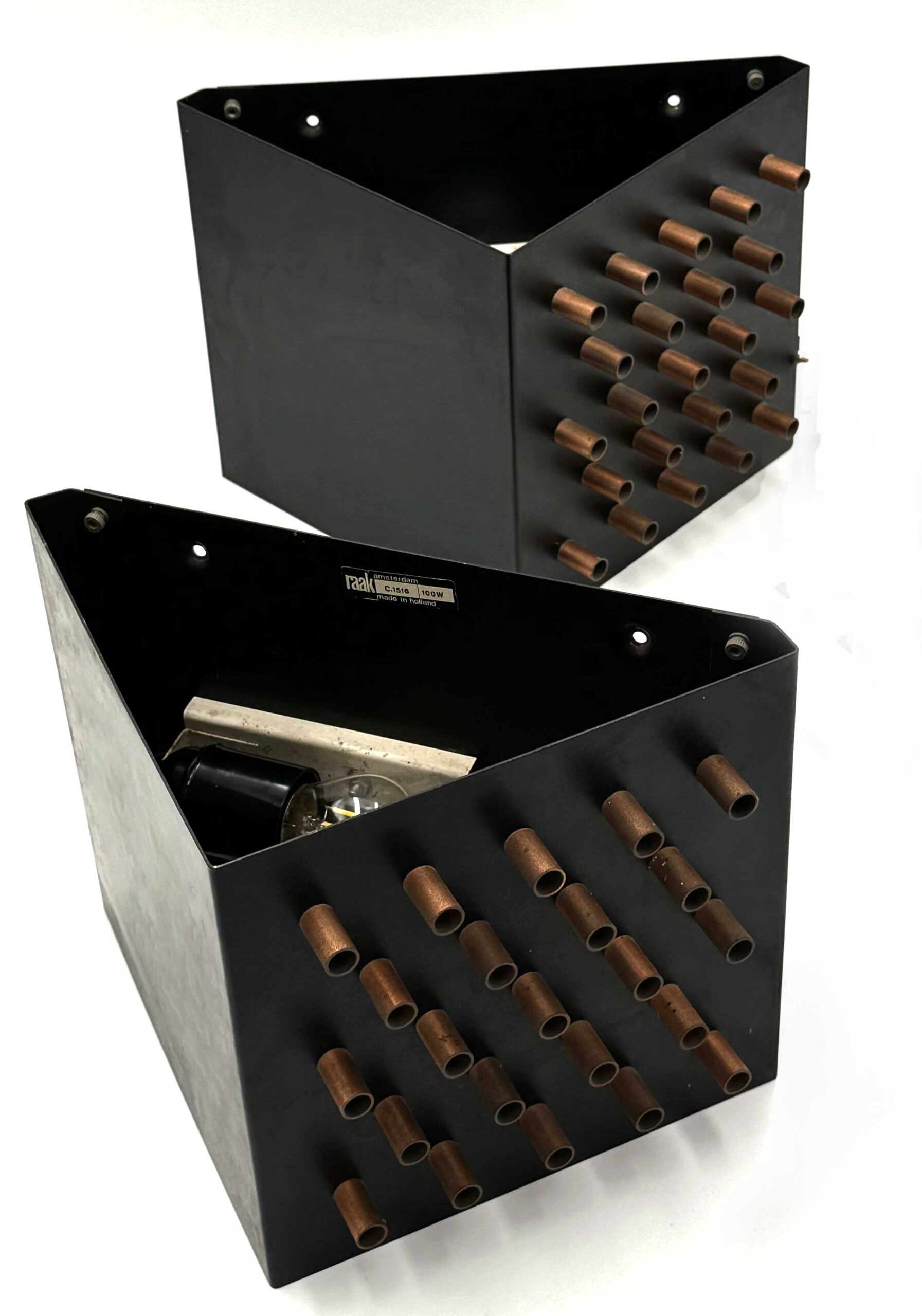 Deze set wandlampen ‘Clair-Obscur‘ (Model C-1516) van Raak Amsterdam werden ontworpen door het Raak ontwerpteam (waaronder Nanny Still-Mackinny, Tapiovaara Wirkkala en Frank Ligtelijn) in 1962. In de Raak catalogus van 1962 werden de lampen omschreven als een zwarte driehoeksvorm aan de wand, waarvan één van de driehoekszijden ritmisch doorboord is met roodkoperen kokertjes waaruit het licht opgloeit. Een spel van helder en donker, van ‘clair’ en ‘obscur’. Bijzonder fraai in opstelling van 2 of 3 achter elkaar.