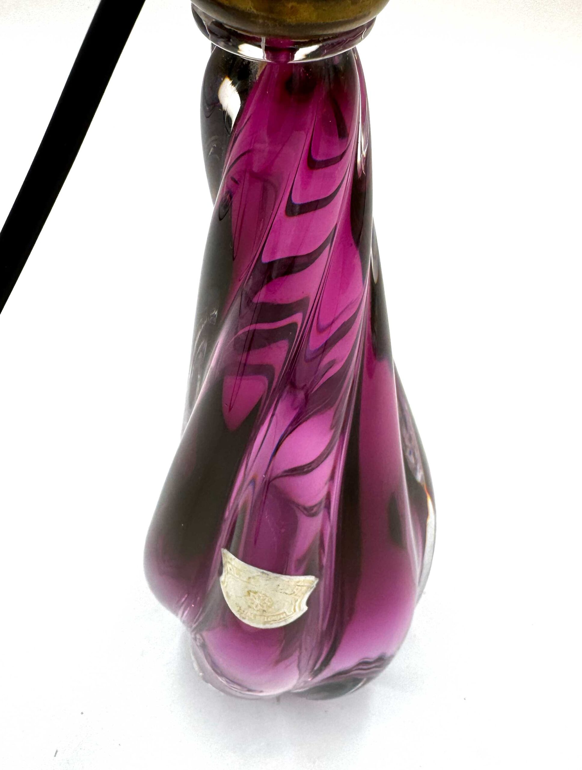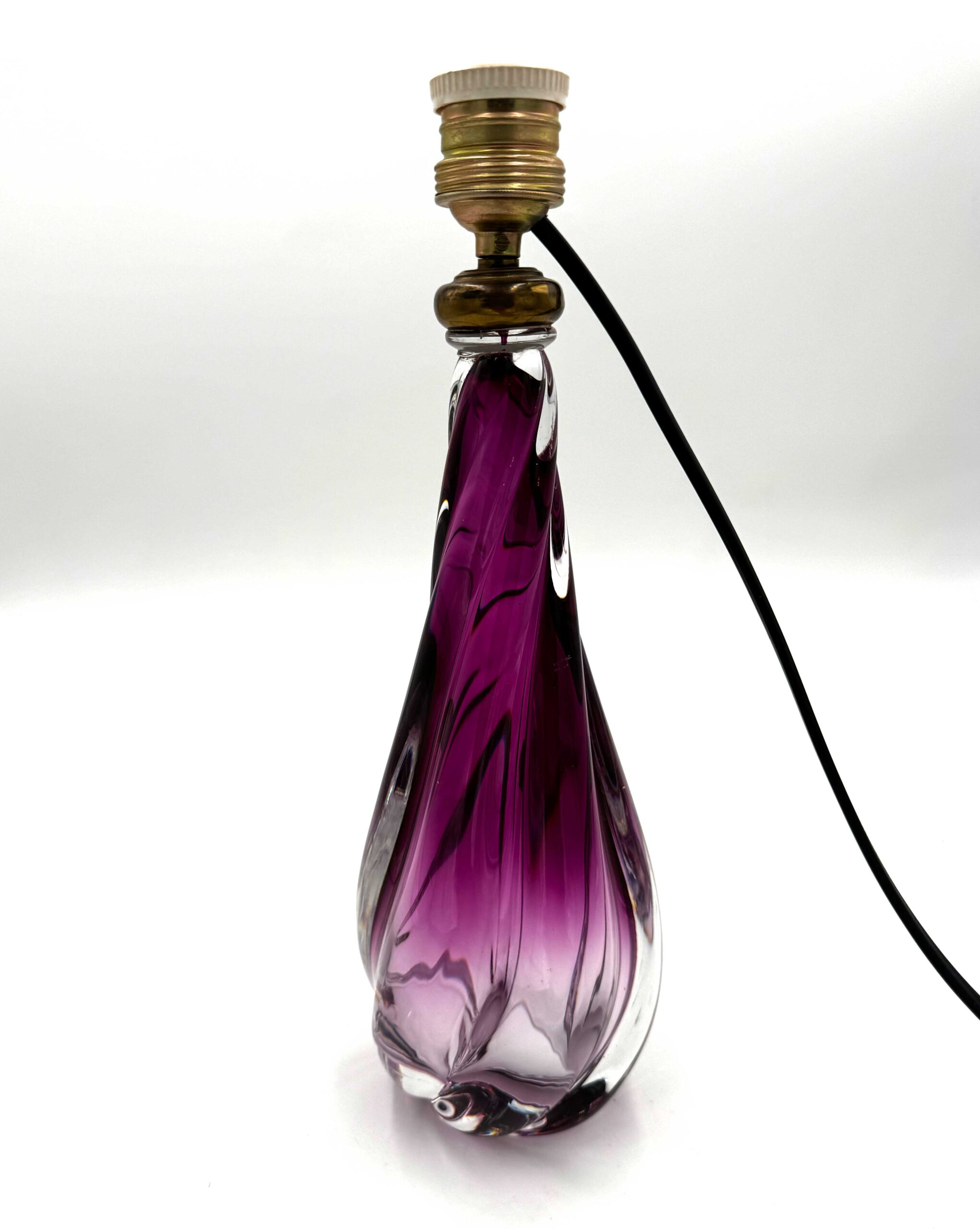 Deze authentieke Val-Saint-Lambert tafellamp heeft een mooie paarse kristallen kleur die donkerder wordt naar boven toe. De voet heeft een kwartslag getorste druppelvorm.